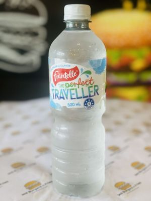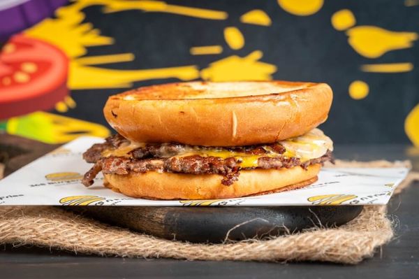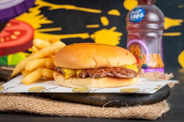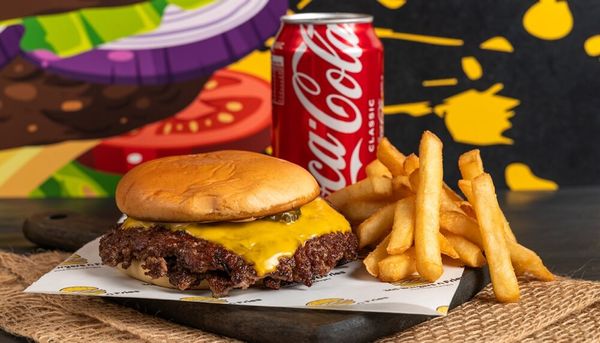 Potato bun, 1x Smashed beef patty, Cheese slice and tomato sauce with Chips and Kids popper.