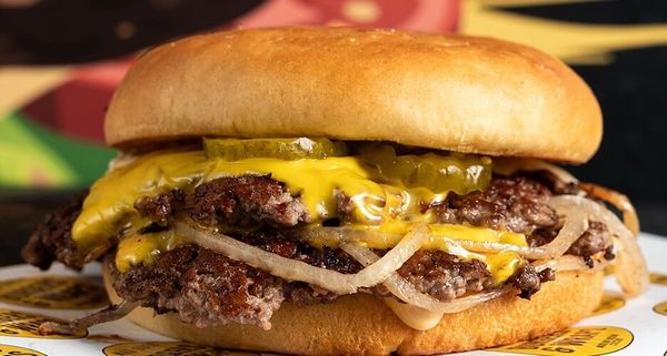 Two smashed beef patties topped with American cheese, grilled onions, 365 smash sauce served on an inverted toasted potato bun.