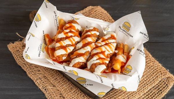 3 Chicken Tenders coated with Buffalo Sauce and Ranch served over Fries