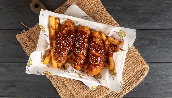 Juicy chicken tenders coated in Korean BBQ sauce, sprinkled with sesame seeds served over Fries