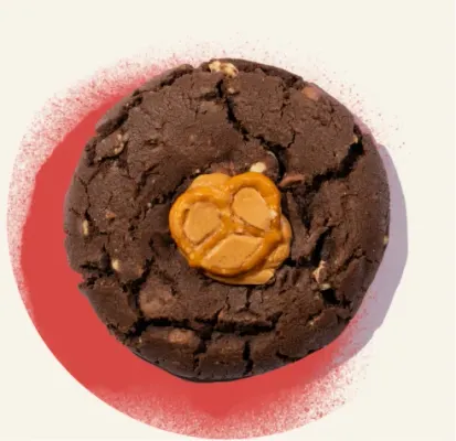Gooey Triple Chocolate Peanut Butter Filled cookie topped with peanut butter and a cheeky pretzel