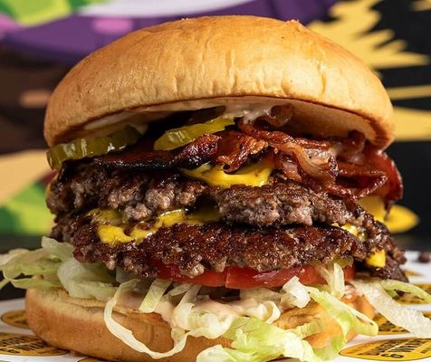 Packed with 4 smashed beef patties, 4 American cheese slices, crisp BandB pickles, grilled bacon, lettuce, tomato, BBQ sauce, and 365 smash sauce on a potato bun.