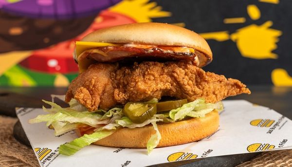 Crispy southern fried chicken fillet layered with American cheese, 365 spicy special sauce, grilled bacon, Jalapenos and fresh lettuce on a toasted potato bun.