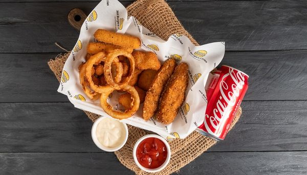 4pcs Chicken Nuggets, 2pcs Mozzarella sticks, 4pcs Onion rings, 10 pieces of Chicken popcorn, 2pcs Chicken tenders come with 2 dips of your choice and a can of Drink